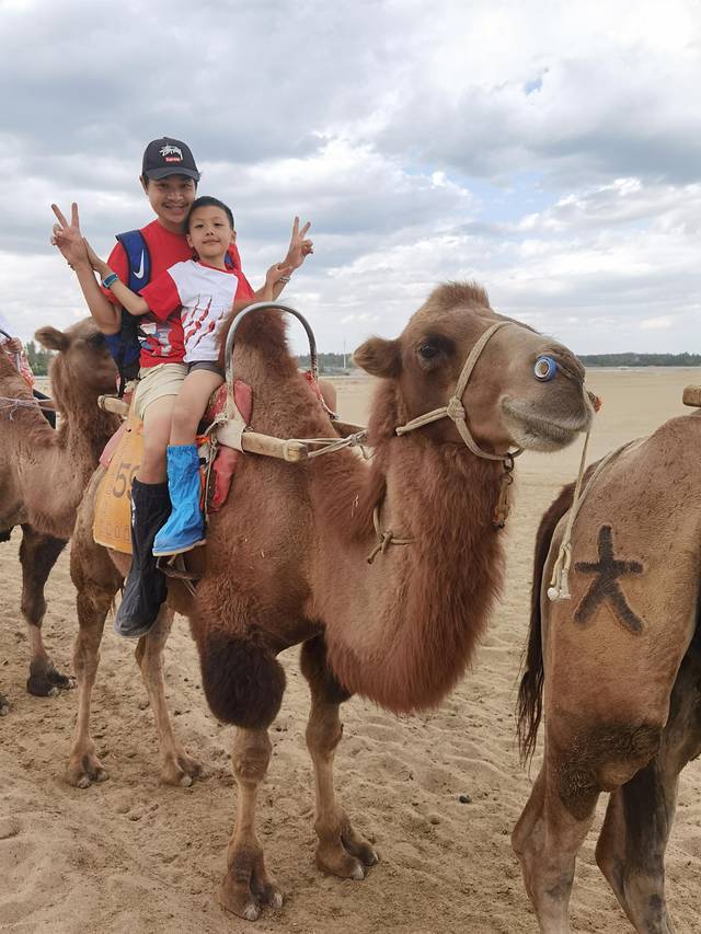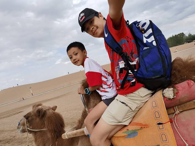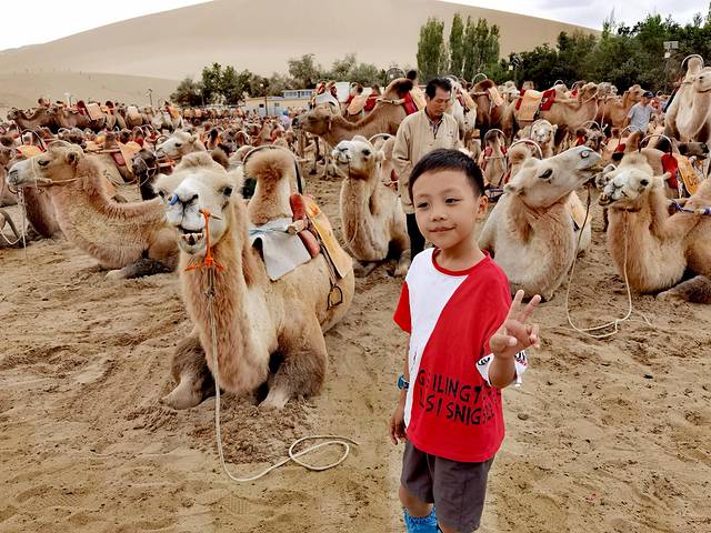 走了一半路,牵驼大哥停了下来,跟我们说他可以帮我们拍照,收费20元任拍,当然他也不会强迫,给不给自我决定。不过说实话,他站在一旁拍确实比我们自己偷拍的角度要好很多,还可以拍到全景,所以如果想留下美好的回忆,这20块还是值得付的。我们这一队人只有我“关照”了他,所以后来一路上,他跟我特别好聊,对我也热情了很多,我跟儿子说的粤语他也听得懂,原来他早几年也在广东打工,后来发展不理想就回来老家牵骆驼了,他还说这里的骆驼都要经过培训,培训完要考试的,及格的可以出来为人民服务,不及格的回笼再培训,如果连续不及格的可能就要成为桌上的美食了。