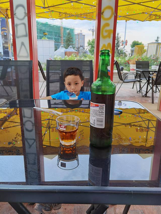 张掖的太阳很晚才下山,回到市区已是晚上8点多了,天还很亮,我和儿子坐在路边的烧烤档一边吃着烧烤,喝着当地特有的饮料,一边欣赏着日落,人生一大美事啊!大概到晚上十点,太阳才会全部落山,我们也吃饱喝够,回酒店休息。