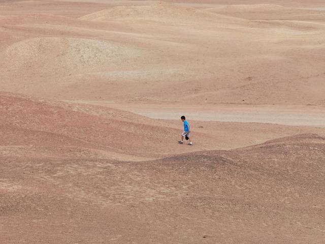 经多次尝试之后我慢慢总结出来经验:如果踩着沙子一步一步往上走的话,由于身体的重量,你往上每走一步沙子会让你往下滑掉半步,这样事倍功半会走得很辛苦。如果手脚并用着爬的话重心低了,就不容易往下滑了,这会比只用双脚走要快很多。于是我的童真被激发出来了,学着小孩那样手脚并用,像只猎豹一样向山顶奔去。