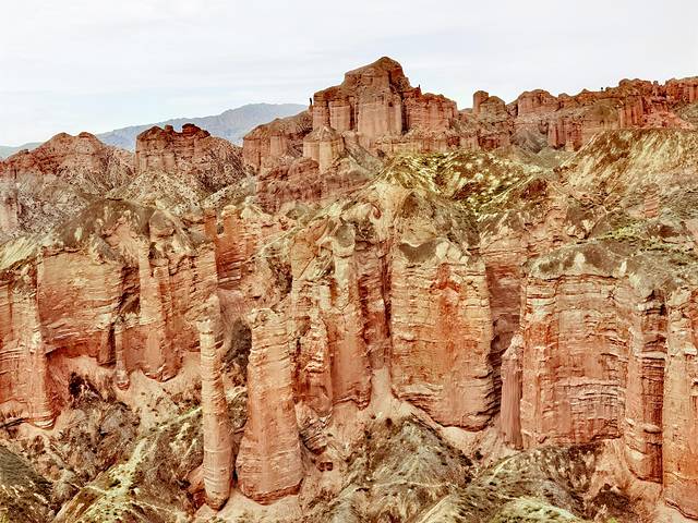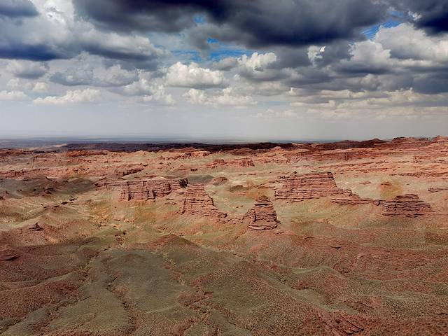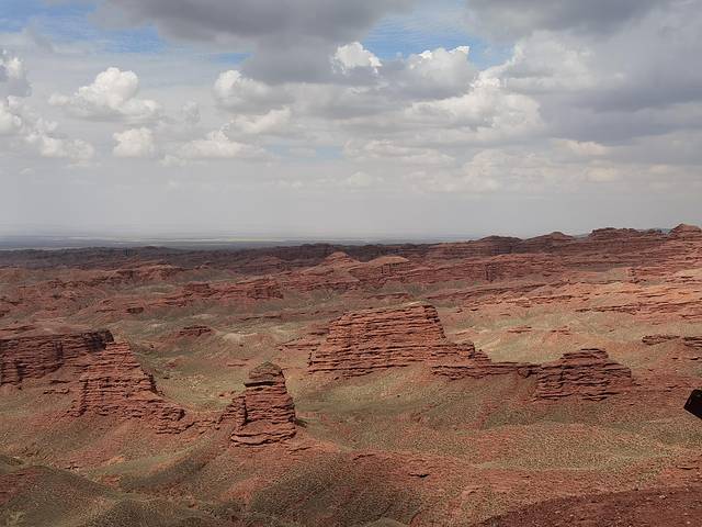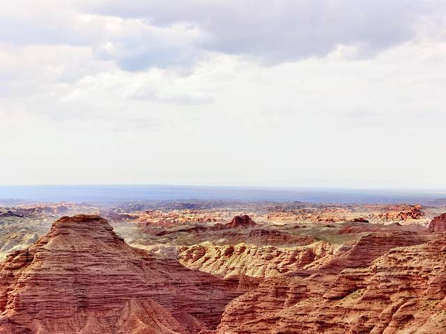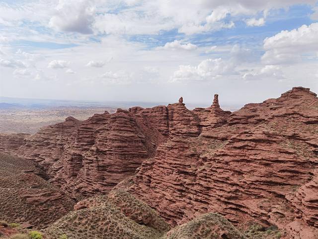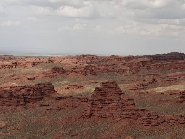 我们下车登上了观景台,不看由自可,这一看啊,保证让你终生难忘。我看到了相信是我目前为止看过的最为壮观的风景,那种美简直是无法形容,在场所有游客都发出了同一个声音:“哇!” 然后纷纷举起相机拍个不停。在这里放眼望去是一望无际的一座座深红色石山,在经过数亿年风沙侵蚀而形成的奇特的深红色雅丹地貌,此时午后的阳光照射在群山之上显得尤为靓丽大气,不禁令人对祖国河山之美产生无限的赞叹。(先上图让大家感受一下吧)