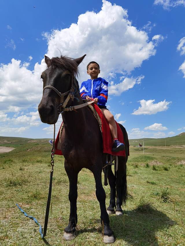 来这里的游客很多都骑马游览,这里游客不少,马匹都很抢手,来晚了可能就要等了,大姐提前帮我们预订好了马匹。为我们带路的是一位经验丰富的师傅,听说以前是驯马的,现在退休了,刚开始的时候由于担心儿子一个人骑不来,所以师傅与我儿子同乘一匹,我自己骑一匹。我们骑的那两匹马是这师傅自己养的,是两兄弟,名叫大黑和小黑,一匹8岁,一匹6岁。师傅还教了我们怎样控制马匹:脚跟轻磕马的肚子它就会跑起来,用力拉缰绳口中大喊一声“吁~~” 它就会停下,拉左边的缰绳马就左转,拉右边就右转,上坡时身体要前倾,下坡时身体要挺直......