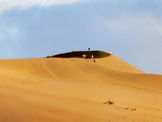 驼队陆陆续续出发了,一开始会爬上一座沙山。