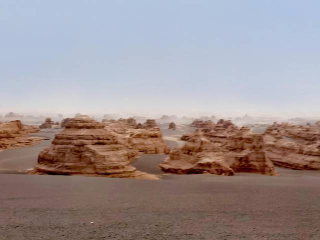 离开玉门关之后,继续前往今天最后一个景点:雅丹地质公园(也称魔鬼城)。中国西北部有几个魔鬼城,这是其中一个,其它大部分在新疆。魔鬼城里面都是雅丹地貌,由于这里风沙很大,特别到了傍晚之后,风刮在这些石山之上发出的嗖嗖作响之声会令人毛骨悚然,感觉像魔鬼在嚎叫,所以称之为“魔鬼城”。在地图上可以看到这里已经是甘肃省与新疆省的边界,由于新疆在我们出发之前的几天爆发了疫情,封关不能进入,所以这里也是我们这趟35天的旅程所能到达的最西边的地方。