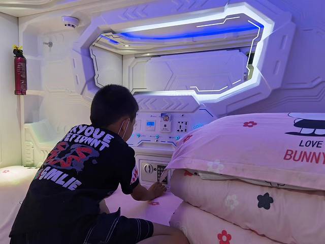 因为到达这里的时候已经是晚上10点钟了,明天一早就会前往关城游览,我们只需找个地方睡上一觉,就不太讲究了,提前在网上预订了市里的“牧马人青年旅社”。这个青旅很有特色,床全是太空舱设计,可能是这里离酒泉发射基地不远吧。这里约有一百个舱位,分上下两层,每个舱里面都很现代化:独立空调,wifi,USB充电口,LED床头灯,密码箱等等一应俱全,被铺也是卡通图案,儿子一看见就开心得不得了。虽是青旅,但这里挺干净的,可以洗澡,还有桌球台,吧台等等,老板也十分热情,这里住一晚只需30元一个舱位,很划算,我们也解锁了一个新的体验。