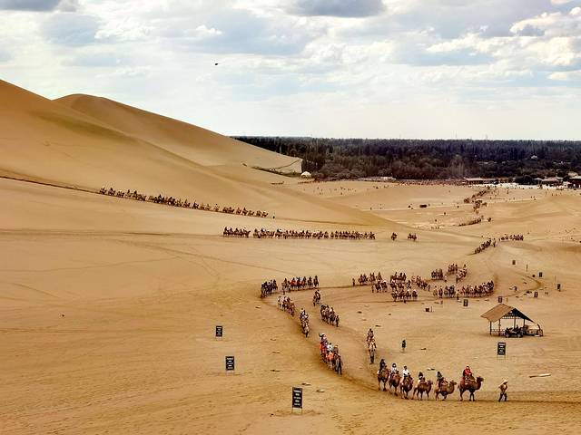 鸣沙山其实是一个沙漠,我们现在游玩的地方是划出来一小片改造成的一个沙漠主题公园,但除了这一片,这里就是一个不折不扣的大沙漠。来这里不用提前预约,到了直接在大门口买票进去就可以了。进了大门又看到有许多卖娱乐套票的窗口。这里的娱乐设施包括:骑骆驼、滑沙、越野车、滑翔机等等,很多项目不知道儿子怕不怕,所以我们没买套票,直接去买了骑骆驼的单次票,100元/人,小孩子规定要和大人同坐,所以没收费。