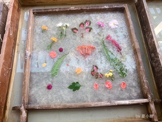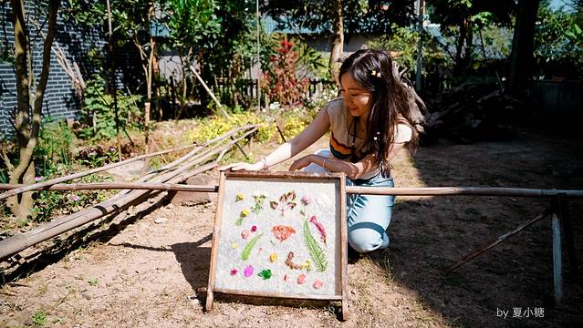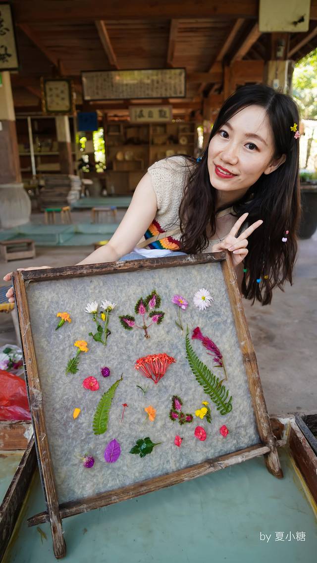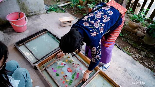 我小心翼翼地摆放,怕破坏了还没成形的纸浆,阿婆又从自家院子采来更多新鲜的小花,要我挑选。