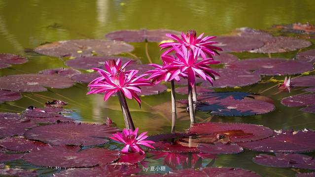 池水清澈,白色茜色的莲花也像漂浮在空中。