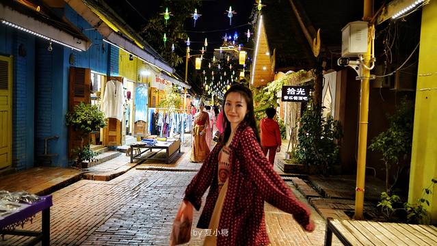 水上的桥通往名为六国的夜市,这里比外面稍安静,卖的东西也有不同,色彩明快的民族大褂,印染织物,手工艺品,还有香喷喷的鲜花饼,和排队放水灯的姑娘们,眼花缭乱。