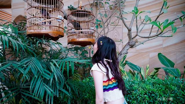 酒店门口三只孔雀,两绿一白。门廊之外,水面空盈,头顶一只鹩哥,大叫你好。