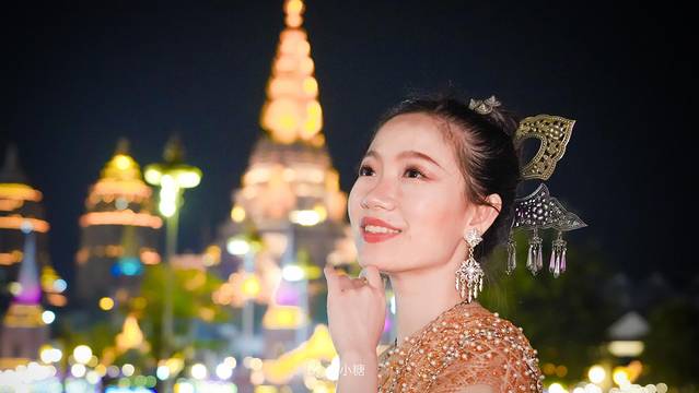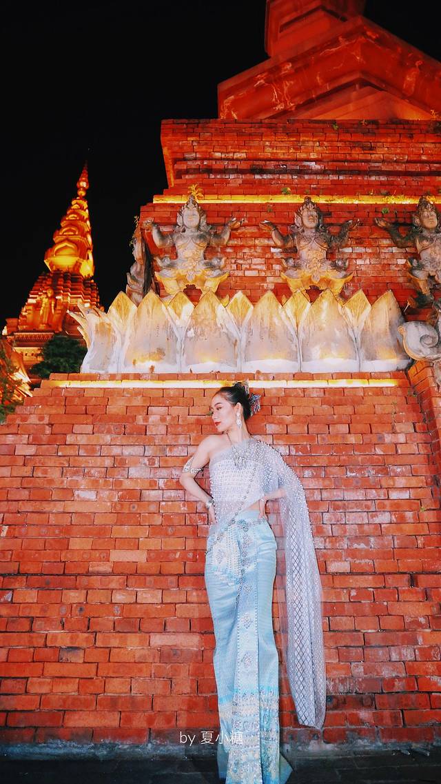 我选了一套素雅蓝色的衣服,说是傣装,其实更接近泰装,傣装要朴素得多,但我头上戴的的确是傣风发簪,泰装的是 小金 塔或者王冠。