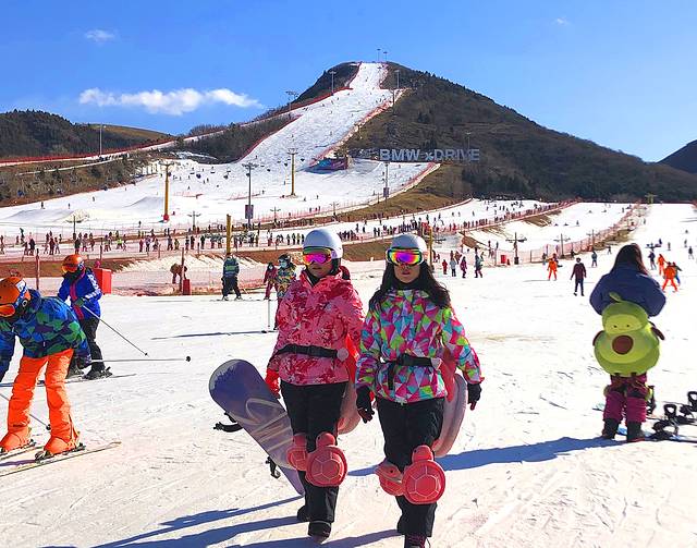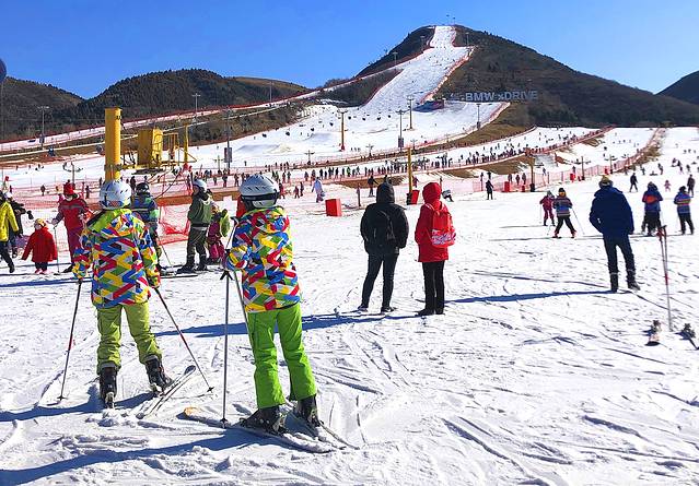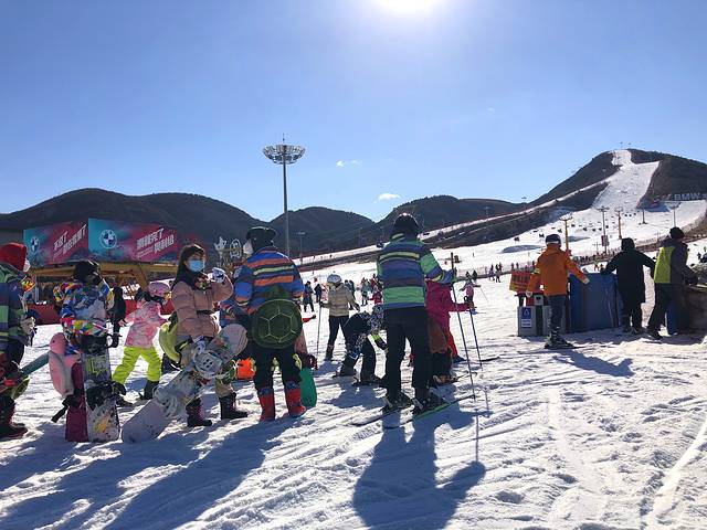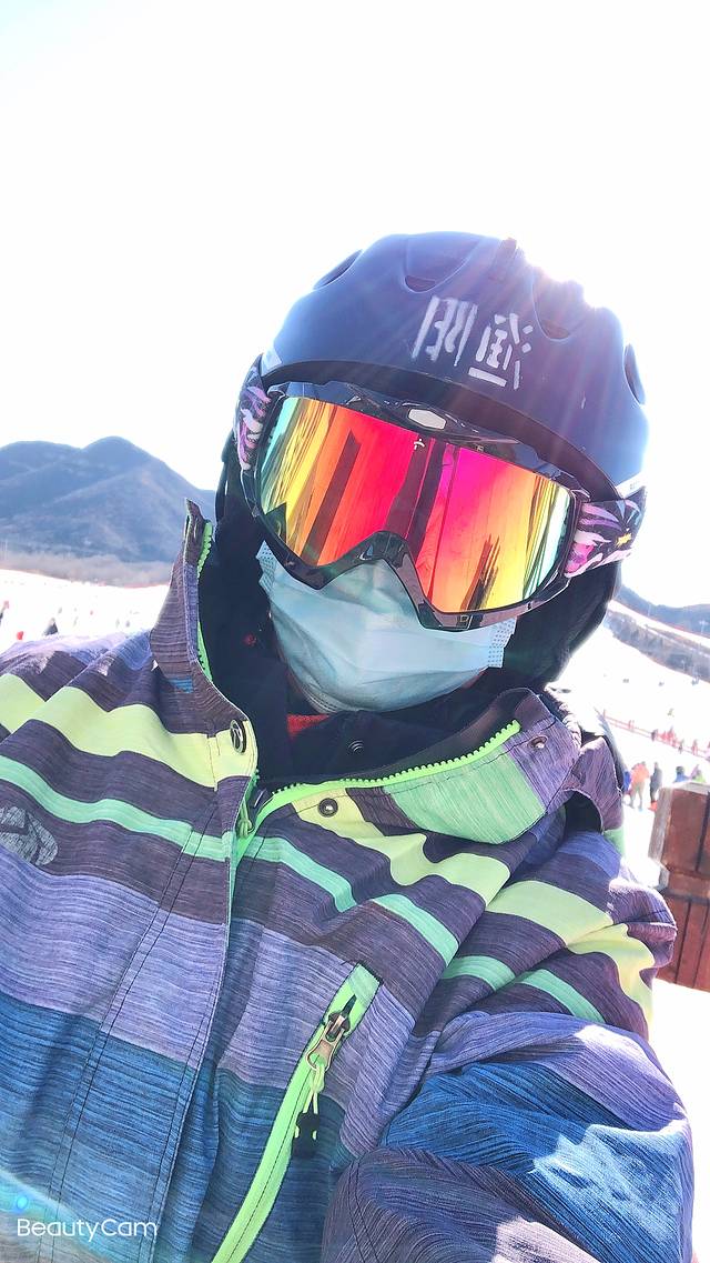 进入滑雪场入口,一个服务员模样的年轻男子热心迎上来,带着我们到大厅各窗口办理手续。交完押金后刷卡依次领取头盔、滑雪服、滑雪靴,然后抱到柜子旁边换衣服和鞋子,一排排一溜溜的柜子和凳子,像澡堂换衣服一样。一番折腾,终于戴上头盔,套上了宽大的滑雪服和笨重的滑雪靴,每人还买了一双手套,最后领取滑雪板(双板)和滑雪手杖,从后门出了大厅,来到了室外滑雪场。只觉得眼前豁然开朗,哇,这个滑雪场好大,整个一座山从山顶到山脚分为好几个不同长度、坡度的滑雪道。蓝天下,大山静默,阳光初照,条条白色的滑雪道耀眼闪亮,颇有气势,很是壮观。男服务员一边帮我们穿滑板,一边介绍教滑雪的时间和费用,说是每人2小时300元,三人合计6小时900元。这时我这才知道这位所谓的服务员原来是教练员,这价格有点意外,感觉有点上套了。但是考虑到人家鞍前马后忙活了半天实在不好推脱,再说对于滑雪老婆和孩子还有点基础,我可是大姑娘上轿头一回,中年大叔了一点基础也没有,安全起见的确需要教练,最后谈好了4个小时600元的学费。教练人不错,教的还算耐心,在平地上教了基本要领,控制速度和刹车,摔倒的方法等。然后拉练到初级雪道上练习了几个回合的下坡,教练说进步很大,但是个人感觉还是比较紧张,身体重心把握不好,动作有点僵硬,左右脚不协调,下坡时方向容易跑偏,刹车不容易刹住,看来滑雪不太适合我呀,就当出了透透气、练练胳膊练练腿了。快到中午的时候提前让教练走了,中午吃完饭休息休息,下午自己单练单飞。
