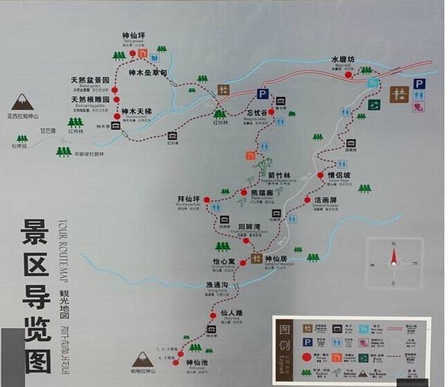 左边 主要是:忘忧谷、箭竹林、神 仙居 、回眸湾、神 仙居 、仙人路,神仙池。