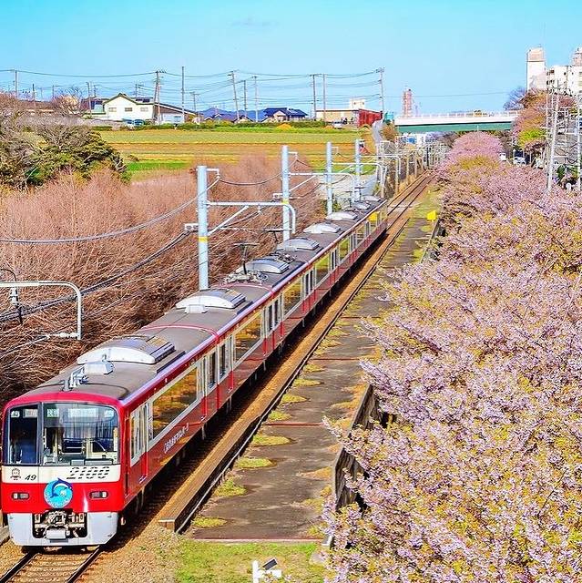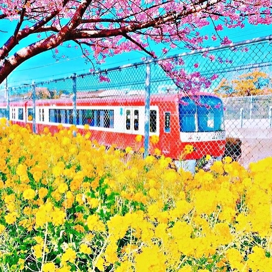 樱花,油菜花,蓝天,电车的完美结合,像极了动漫里的场景。