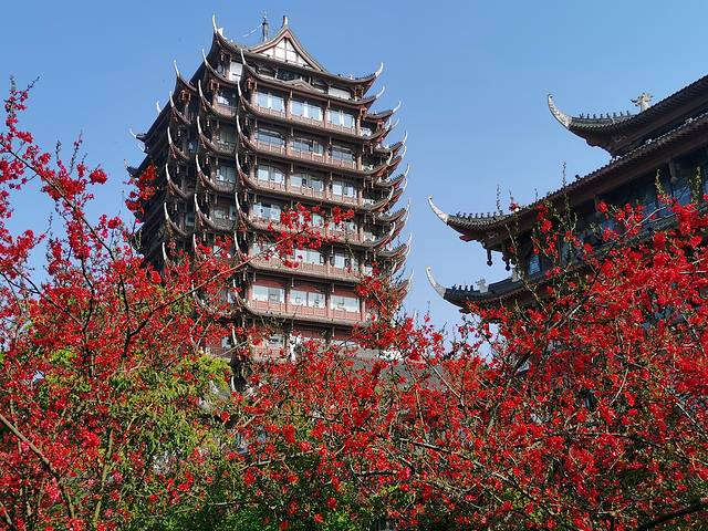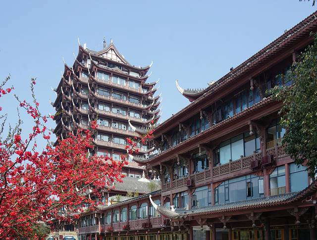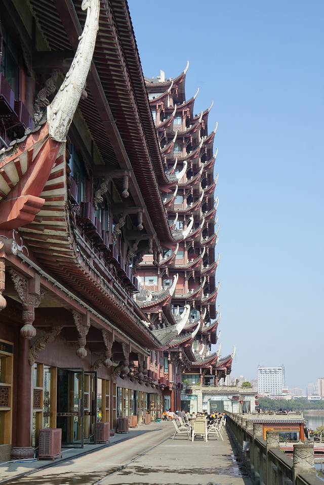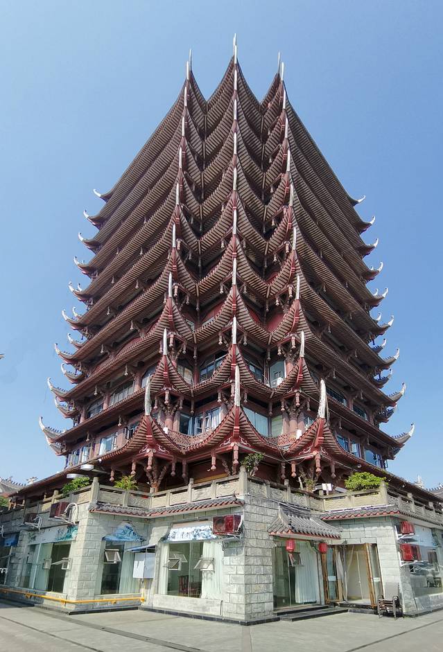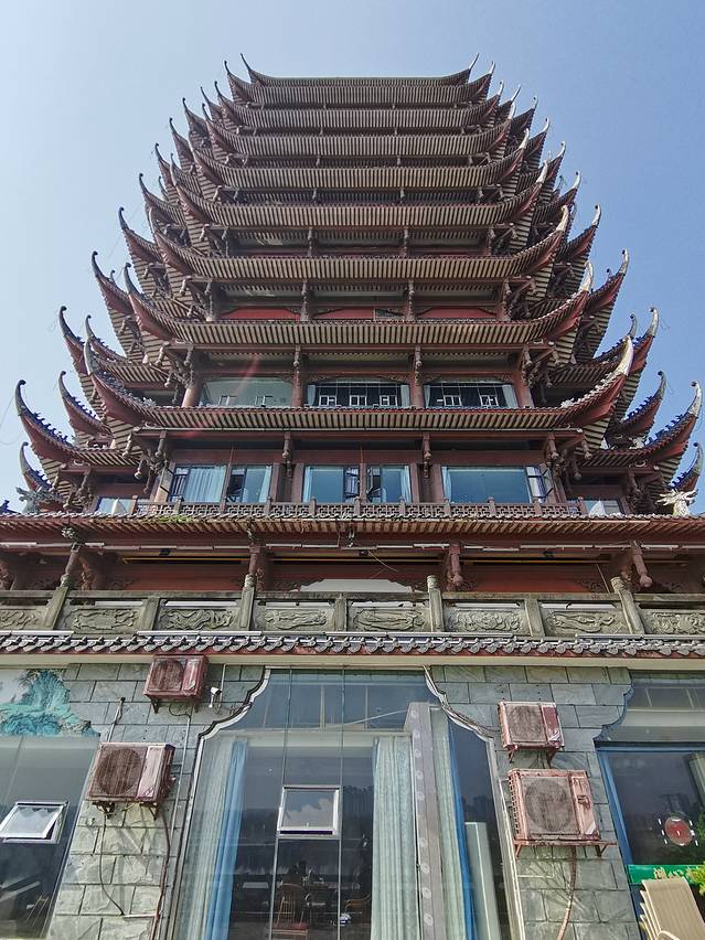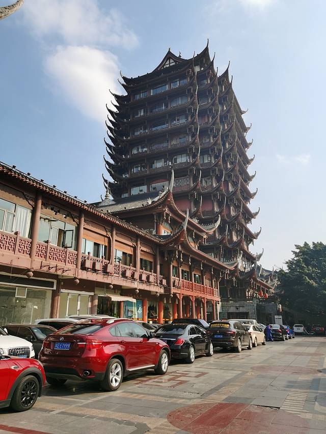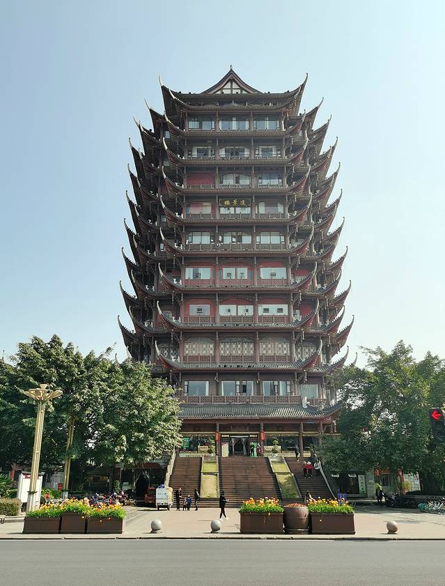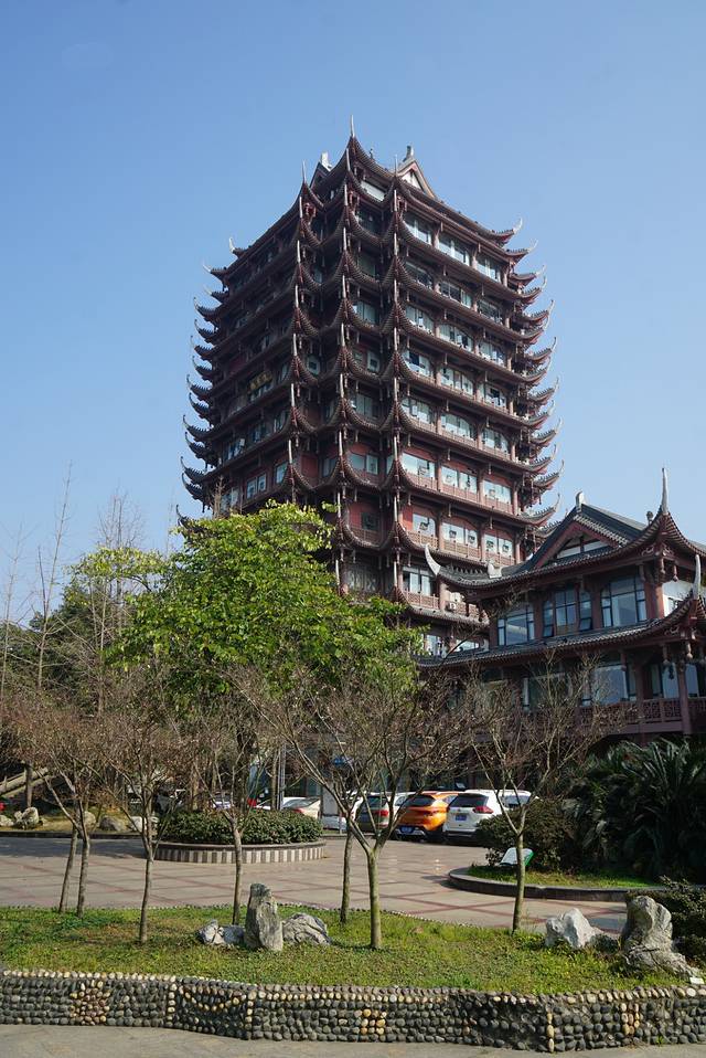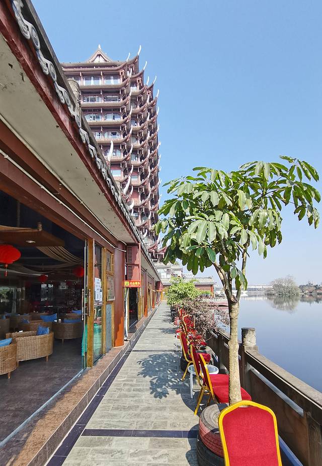 这次是专为造访东坡湖旁的远景楼而来的,它是目前全国最高大的仿古建筑群之一,在国内名气越来越大。远景楼是北宋眉州知州黎希声在元丰年间主持修建,宋元明清朝代更替,远景楼损毁于兵火,清代乾隆年间修复。远景楼主楼共13层,高80米,裙楼也有5层,凭栏远眺,可尽享北宋著名文学家苏轼在所赋散文《眉州远景楼记》中所说的“登临览观之乐,山川风物之美”的意境。苏轼,号东坡居士,是四川眉山人,在担任徐州知州时,听闻家乡书信谈起先父苏洵的朋友,眉州知州黎希声的种种善行,应邀创作了一篇散文《眉州远景楼记》。文章从家乡三个淳朴、带有古风的风俗谈起,对黎侯顺应民风民俗,发扬宽简清静的政治大加称颂。说“若夫登临览观之乐,山川风物之美,轼将归老于故丘,布衣幅巾,従邦君于其上,酒酣乐作,援笔而赋之,以颂黎侯之遗爱,尚未晚也”。
