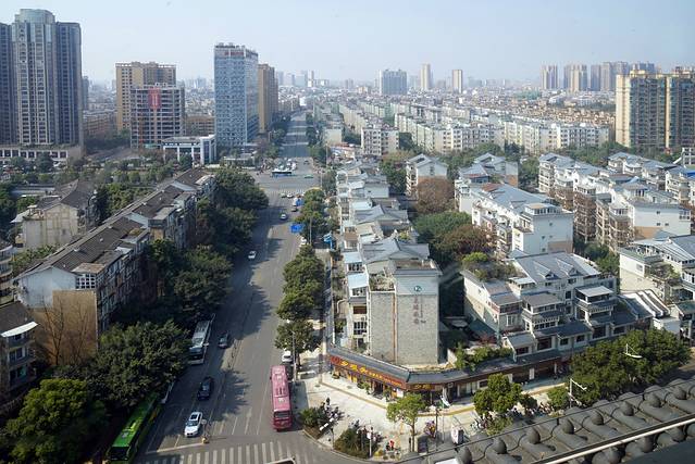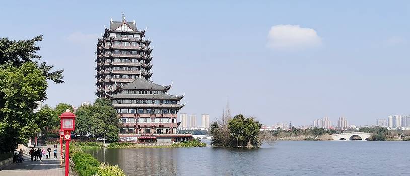 远景楼在眉山市东坡区东坡城市湿地公园的西侧,从湖滨路进去可以从各个角度观望,也可以在隔着弧形岷江支流对面的湿地公园瞭望。