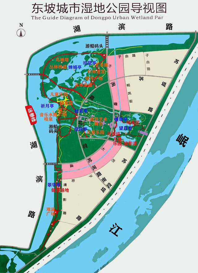 图中标出了远景楼和东坡城市湿地公园的位置,以及同周边公园和景点接壤的关系。