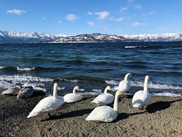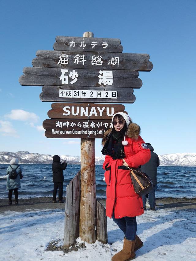 屈斜路湖是日本最大的火山口湖,冬季时湖面会被冰雪覆盖,但因为湖底有温泉涌出,如果在岸边把沙子挖开的话,会有温泉涌出,湖边就有一个免费的足汤,我们那天湖面并没有冻上,只是有少量的浮冰,一个朋友在我后面几天去的,他去的时候整个湖面都结了冰,冰上覆盖着白雪,美极了