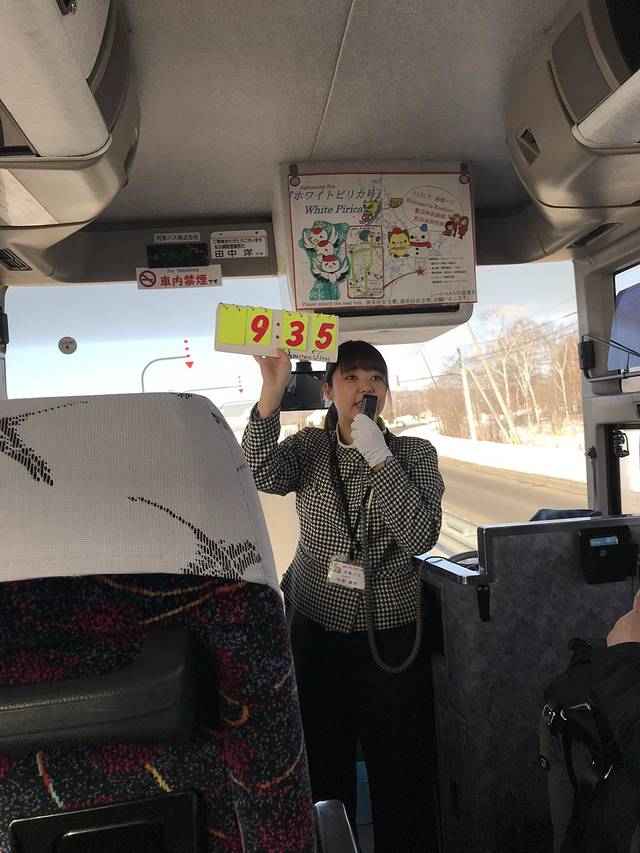 阿寒巴士每辆车都有一名导游,我们的导游是个漂亮的小姐姐,一路都用日语温柔的讲解,我们这一车都是中国人,也不知道有没有人会日语,听不懂也没关系,每次下车时小姐姐都会拿个时间牌提示上车时间