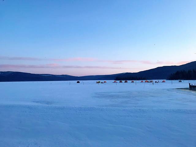 早上起床后先去八楼泡温泉,八楼的室外温泉可以看到阿寒湖,我去的时候正好看到日出,太阳从雄阿寒岳升起来,把天边都染红了,晨光洒在阿寒湖冰面上,非常好看,由于泡汤不能拍照,所以赶紧回房间穿上羽绒服跑去湖边看日出,结果这样一来一去,到达湖边时太阳已经完全升起来了