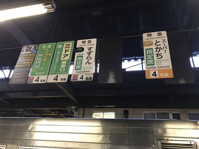 站台上方悬挂着很多车次的代号及车厢号码的指示牌,车次代号在车票上有显示,例如我们要坐的车是SUPER TOKACHI号指定席2车厢,找到对应的指示牌等车就可以了
