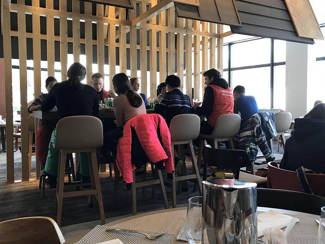 把护脸交给小朋友后我也不想再动了,自己去酒吧那里等小朋友,酒吧这里靠窗这边都是大的落地窗,可以看到外面的初学者滑雪,这里边有沙发,很多家长坐在这边看自己家的小朋友滑雪