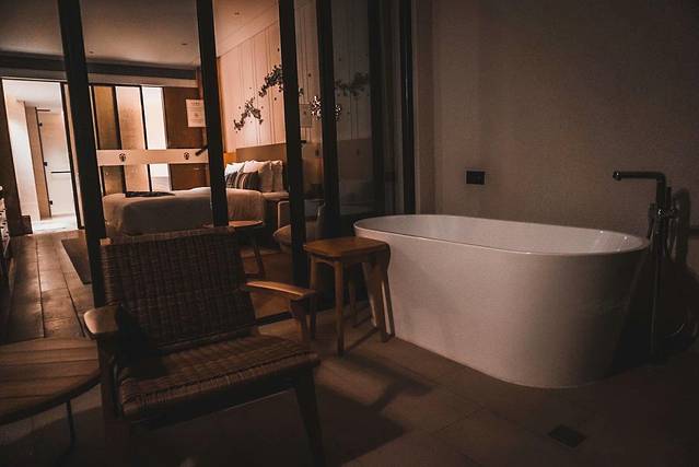 像个好奇宝宝的转了房间一圈,阳台窗边的三角梅花开正好,被风吹落了进来有点小浪漫。阳台的浴缸有点孤独,太热真的无法做到优雅的在阳台泡澡。不过酒店很贴心的在室内也设计了浴缸给我这种根本一点热度都受不了的人