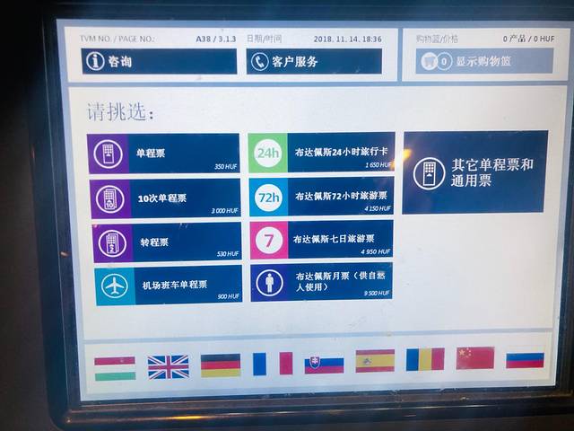 Budapest的购票系统真的是很温柔啊,居然还有中文哦~看到熟悉的文字真的是超级高兴激动。文盲了这么多天看到母国的文字都是欣慰的。支付方式也很棒呆,银行卡和现金都可以,有单次卡及72小时等等几种选择