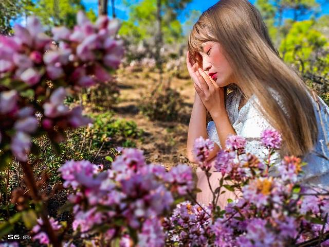 花海一直是美女拍照的必打卡之地。不过由于杜鹃花树比较矮,所以蹲下来拍也不失为一个好主意。