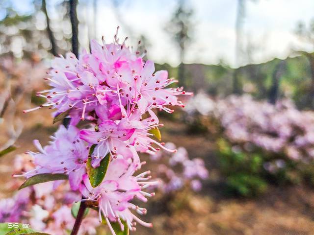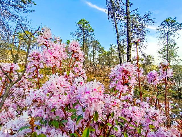 此时正值杜鹃花期,粉红色的杜鹃花开满整个山野。放眼望去,一片粉红。