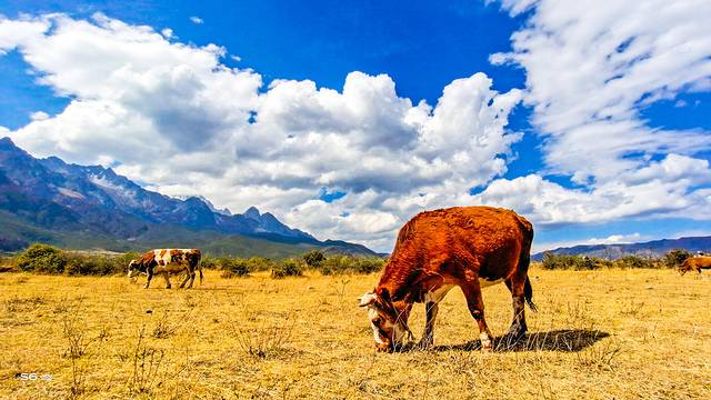 随地坐在草地上,干枯的草根绵软舒适,温暖的阳光打在身上,头顶是蓝天白云,眼前是牛羊成群,远处是雪山树林,深吸一口气,还夹杂着雪山的清冷和草甸的清新,回归大自然,仿佛身心都被净化。