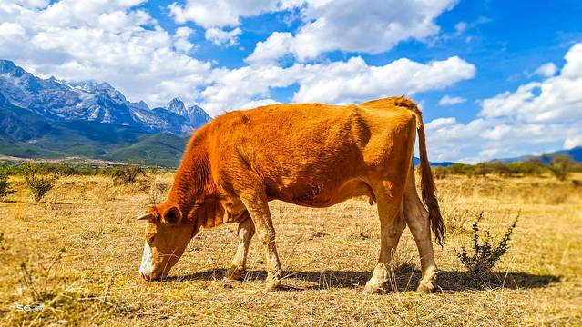 玉龙村位于玉龙雪山脚下,海拔2430米,年平均气温只有8.9℃。受海拔与雪山影响,在每年四月这个时候,玉龙村的温度才10度左右。毗邻着雪山的玉龙村,抬头便是绵延的雪山,但并没有完全开发成景区,牛羊放养在草甸,任其自由觅食。