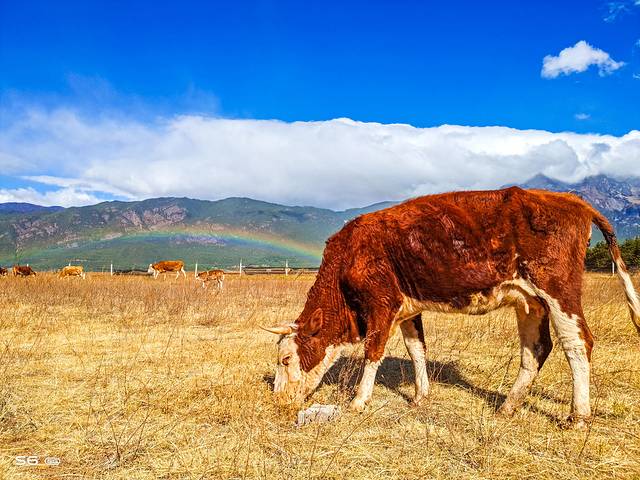 神奇的是,在这么阳光明媚的晴天,玉龙村的草甸上竟然升起了一架明媚的彩虹桥。用手机拍彩虹,这也是我头一次。