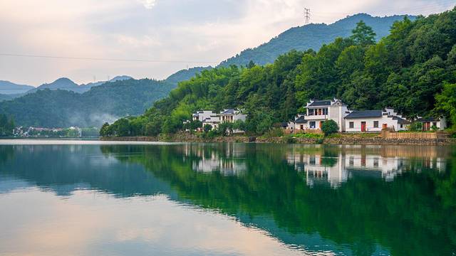 储家滩这一带位于青龙湾的下游,实则是港口湾水库的一部分,现在已经成为一个休闲度假区,也是宁国重点打造的摄影点。从这个视角看仿佛闯入了仙境,蜿蜒曲折的山脉、静静流淌的河水与天空连成一片,青山中藏着白墙黛瓦的人家,像极了一幅唯美的水墨画。