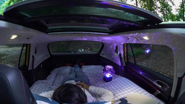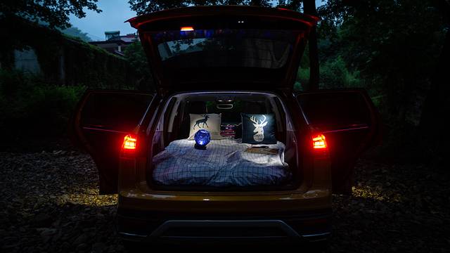将后排座椅放倒,放上车载充气床,铺上清新的北欧风床单,简单操作就能打造出一个属于自己的小天堂。超大的后备空间,为我的流动住所提供了无限可能,后备箱里有电源插口,使用电动充气泵的话几分钟就能完成充气过程,可别傻乎乎的用嘴吹啊。