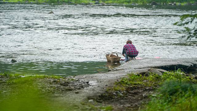 悠悠然漫步到景区深处,看不到几个游客,只见一个村妇在溪边刷碗。