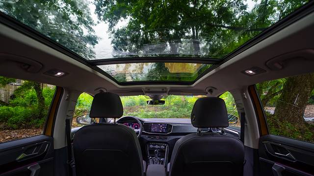 先别急着质疑车里怎么睡,来看看车内空间。打开车门的第一感觉就是沉稳, 内饰采用了单一熏黑的颜色。超大全景天窗不必赘述,这年头已是旅行自驾必备,打开几乎占据了我视野内整个天空的天窗,享受最美好的阳光和美景,树影随着太阳的移动在身上慢慢爬行,不管坐在前排还是后排,都不会感觉在车里坐着压抑。