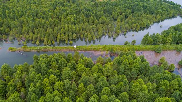 方塘乡有一片湖,生长了大片尖塔形的树林,这就是出了名的落羽杉林湿地。据说这些杉树本是生长在陆地上的,但由于当年修建水库的原因被水淹没,久而久之,杉树适应了水下生活,顽强地活了下来,才有了今天这样一幅诗情画意的景象。