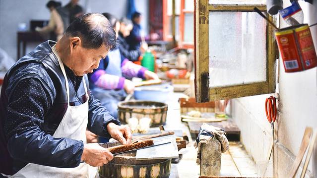 制笔厂里看不见一台机械设备,虽然全手工制作的效率远比不了机械化的流水线,但是为了保证每一支笔的质量,直到今天正宗的宣笔还在坚持手工制作。