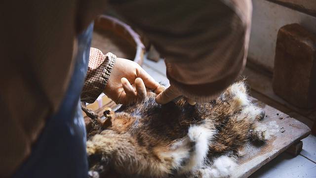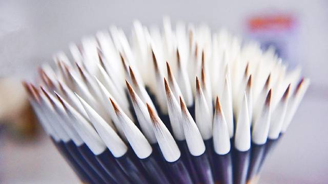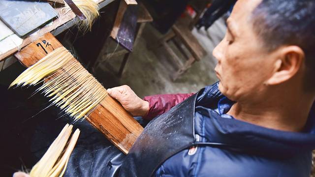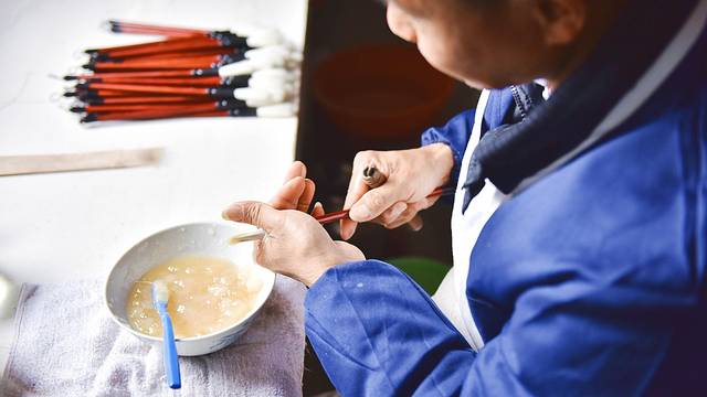 制作笔头是生产毛笔过程中耗时最久的部分之一,将毛的根部理齐,把没用的绒毛梳理掉,再去除油脂后用骨制的刷子进行手工梳理,由于长时间接触凉水,制笔匠人的手上布满老茧和裂纹,宣笔严谨的制作工艺和制笔人付出的心血可见一斑。