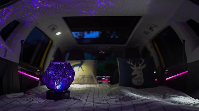 生活中的情调不能少,在车里放上一个星空灯,给平平无奇的夜晚增添了一些跳跃的元素,即使没到夜晚,也能享受这专属于直男的浪漫,车内的氛围灯多色可调,通过中控的简单操作就能设置。在河边支上一两张桌椅,有时候,就是一个人也要活得像一个营。躺在自制的床铺上,透过超大的全景天窗,看着自然原始的密林,独自享受这一刻难能可贵静谧。