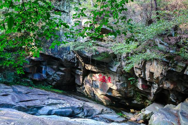走在长达1500多米的山谷间,听着虫鸣鸟叫,欣赏山壁、溪谷河床间的来自从唐代到清代历朝历代书法大家们的题字石刻。
