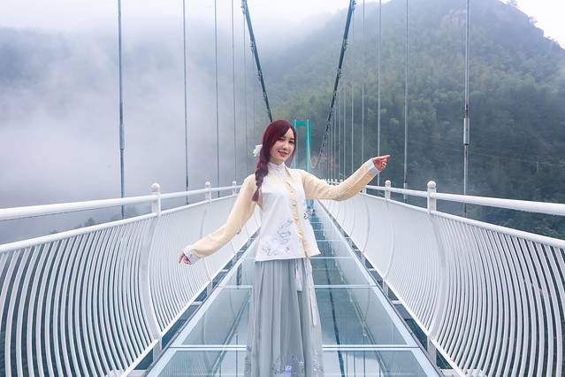 天仙峡的玻璃栈桥很长,横亘在两座山峦之间,山间起雾时站在玻璃栈桥上,给人一种何似在人间的感觉,那一刻自身仿佛置身仙境之中,自己在踩着云彩走。