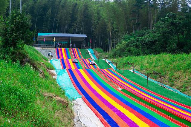 长长的滑道像是一条彩虹,从彩虹滑道上方滑下,耳旁是呼啸的风声,非常刺激,一次不过瘾,那就多滑几次~