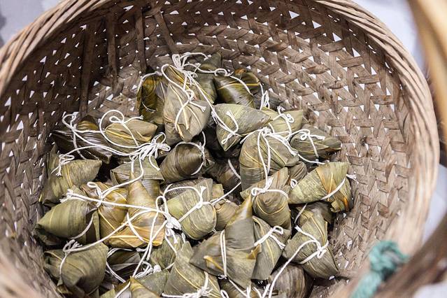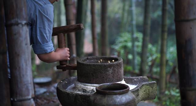 除了做豆腐,何家坞还有手工包粽子,也是一番不错的体验。看包粽子,是一场艺术的享受。一个旧式的老木凳,把线缠在靠背柄端。随手抽出一片粽叶,一叠一卷旋转出漏斗的形状,握于掌心。另一只手将米从水中舀出,沥干水分后倒入漏斗,用手压实。然后再用粗麻线扎紧头,绑在凳上。整个过程,连贯流畅,行云流水。咀嚼着香喷喷的糯米,索绕在心头的不是粽子的味道,而是回忆里的情愫。