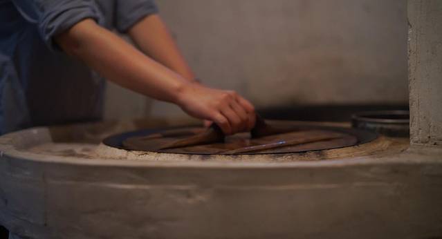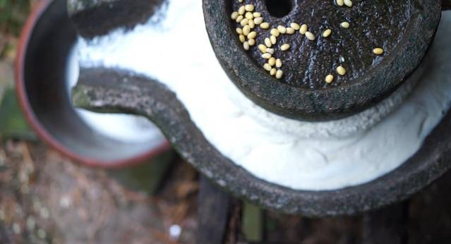 然后用石磨手工磨豆,把黄豆打成生豆浆。