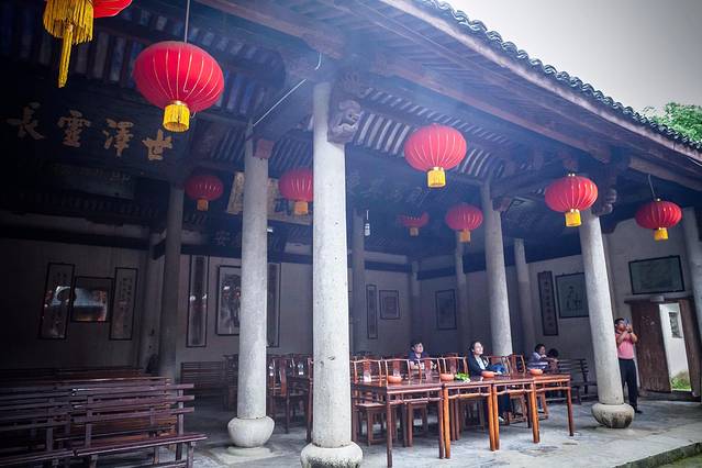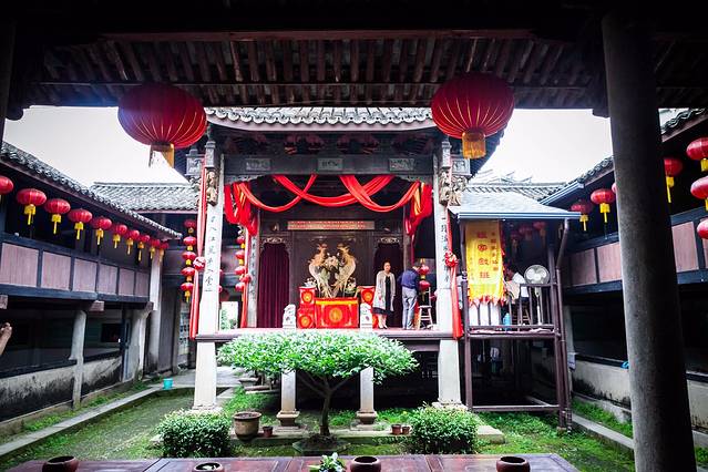 参观完别墅后我们来到了古戏台,施家岙古戏台外面是绳武堂,其实就是一个祠堂,祠堂原本供奉的是施姓的祖宗,后来清末民初的时候,这里变成了越剧的戏台,绳武堂也就变成了越剧发源地的发源地。如今绳武堂已经成了文物保护单位,那里还专门有一个当地的戏班常驻,每日丝竹不绝。