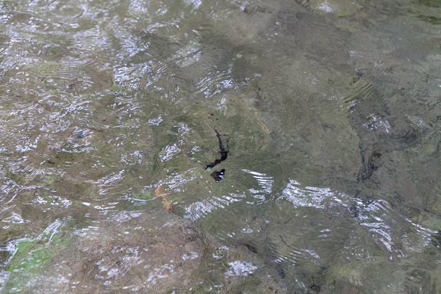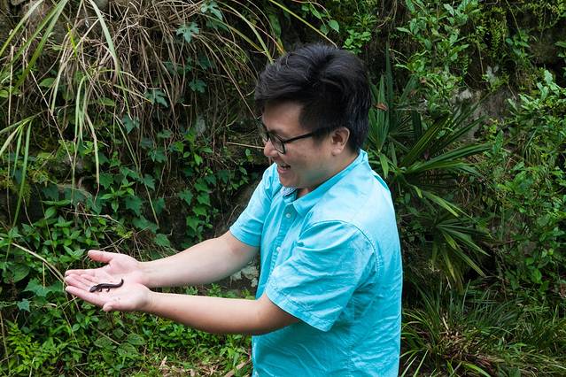 山间旁的小溪就是我们的目的地了,远远望去清澈的小溪底有着一条条黑色的东西,这个就是小娃娃鱼了。