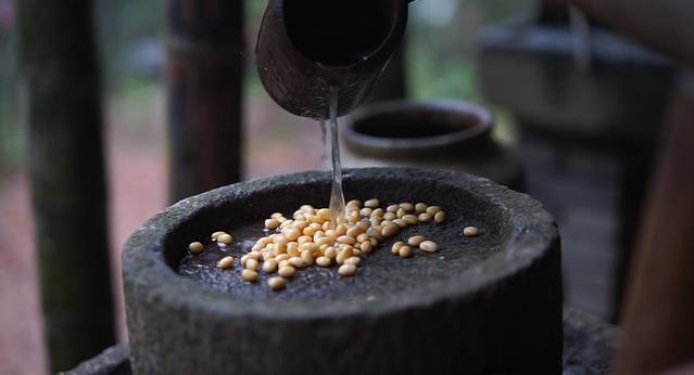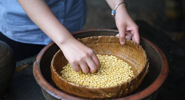 用山泉水淘洗豆子,黄豆挑出杂质、坏豆,洗净,用清水泡一夜,充分泡发之后再洗一下就可使用了。