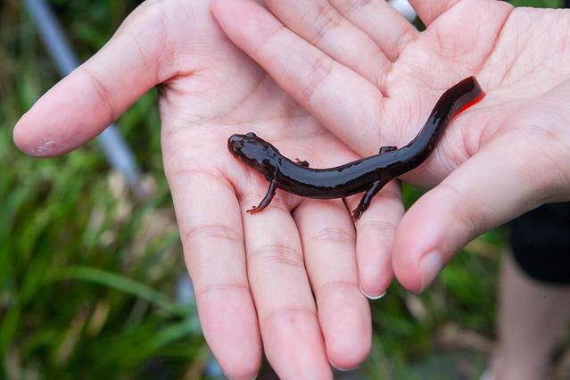 小娃娃鱼游动不快,甚至有点呆呆的,很好抓,抓上来看了看,虎头虎脑的,很可爱。