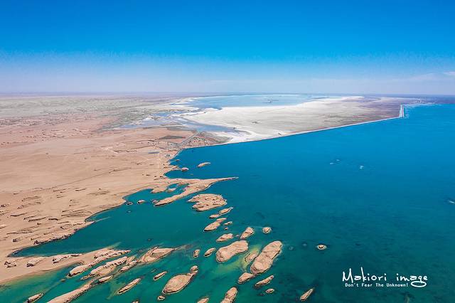 远远望去就会发现湖水上方的天空格外的清透明亮,满眼的蓝色给人以极其强烈的视觉冲击,仿佛来到了人间天堂,这里和不远处的乌素特水上雅丹其实是相连的,也可以看到魔宫般的雅丹。